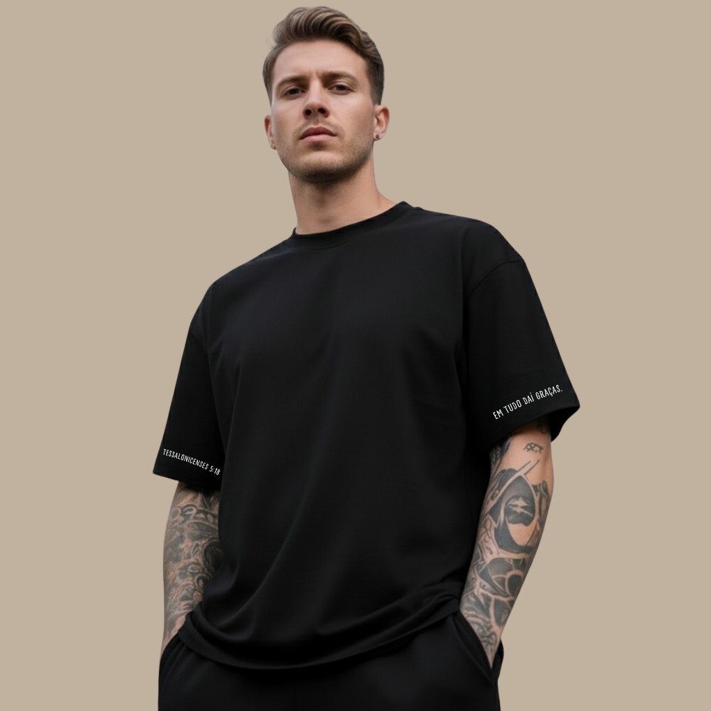 A estampa em destaque apresenta um versículo bíblico cuidadosamente selecionado, trazendo inspiração e propósito ao look. O design minimalista valoriza a mensagem, combinando tipografia moderna e equilíbrio visual, ideal para expressar a fé de forma autêntica e contemporânea.